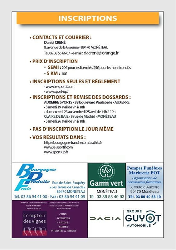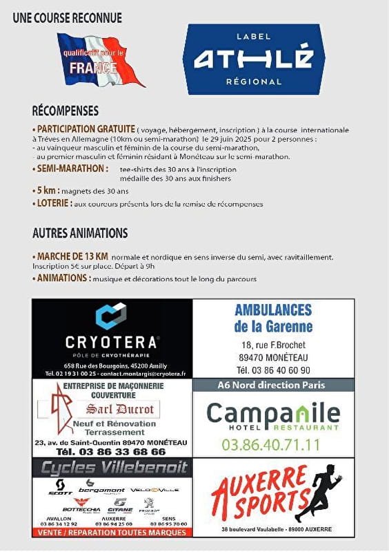 Parcours totalement plat et une seule boucle. Il a le label régional depuis plus de 20 ans, qualificatif pour le championnat de France. Cette année il est support du championnat de l'Yonne. Il est inscrit dans les jours de fête de Jogging international, bornes dans Bipède, et VO2. Animations et décorations sur tout le parcours. Pasta party le samedi soir et plateau après course (sur réservation). 2 Gymnases avec douches. + de 600 coureurs sont attendus. Nouveau parcours et nouveauté un 5 km.