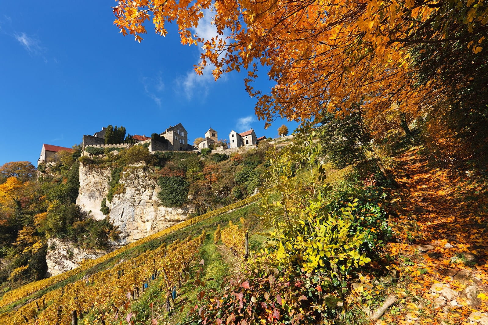 Sentinelle du Revermont sur son éperon rocheux, Château-Chalon est le berceau du Vin Jaune, où légendes et histoires s’entremêlent pour donner toute sa renommée à ce phare du vignoble, membre du club très fermé des “Plus Beaux Villages de France”. La balade vous propose de déambuler dans les deux terroirs emblématiques du village, où tout est difficile pour la vigne et les vignerons : Sous-Roche et Puits-Saint-Pierre, à l’embouchure de la reculée de Baumes-les-Messieurs.Ces contraintes et un environnement hors norme signent ce vin d’exception qu’est le “Château-Chalon”.