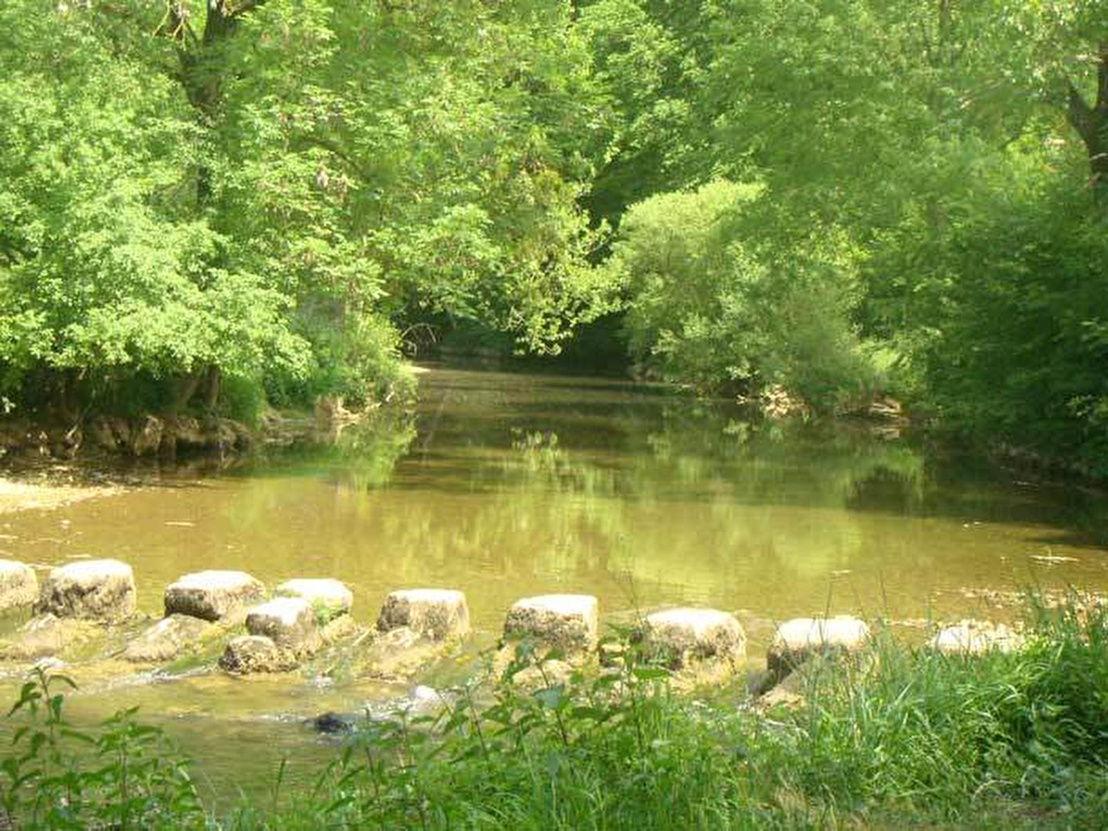 Passer le pont, gagner Chav. le Petit. Retraverser le Suran, la D.42 et gagner Corcelles ; prendre à droite le chemin goudronné qui rejoint la rte de Ceillat. Suivre, prendre à gauche le chemin qui rejoint le bois vert.