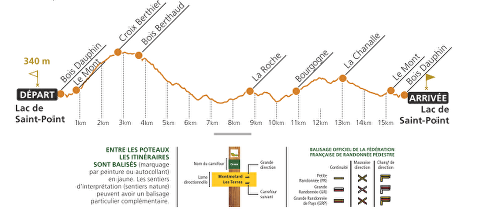 1 - Du monument aux morts, longer le jardin public, tourner à droite et monter au château de Saint-Point, église (XIIe siècle) et ancien cimetière (croix de Saint-Donat). Face au portail du château, descendre la route. Traverser le pont et prendre le chemin pierreux de droite jusqu’à la croix de la Roche. Traverser la D22. Au lavoir de la Roche, monter à gauche le chemin herbeux. Continuer à droite jusqu’à la route et la suivre à gauche. Traverser la ferme et rejoindre la croix « brisée » de Merloux.