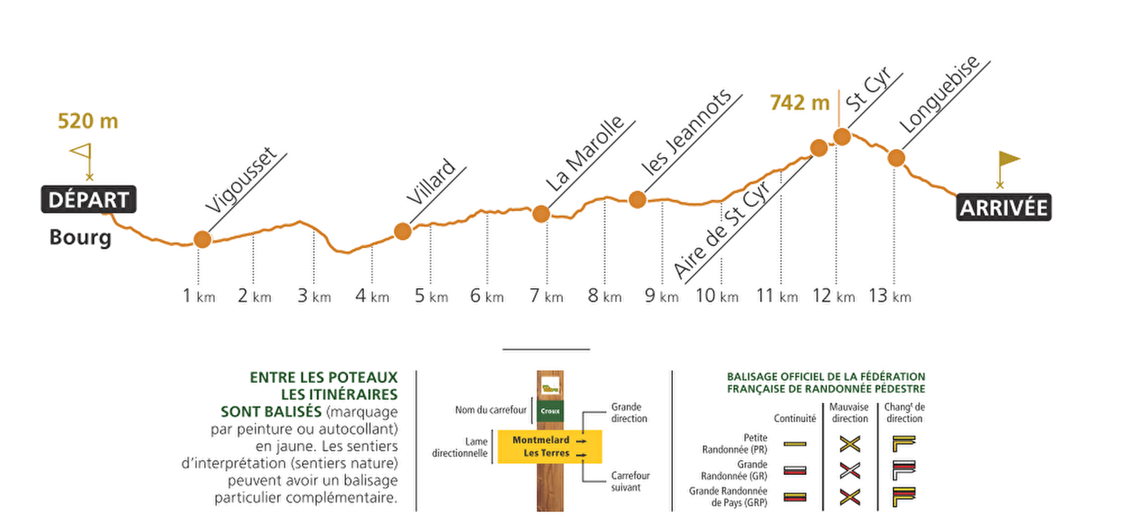 8) Tourner à droite sur le sentier qui serpente jusqu'à une petite route goudronnée menant, à droite, à Longuebise puis à Montmelard. Traverser le village pour retrouver le départ.