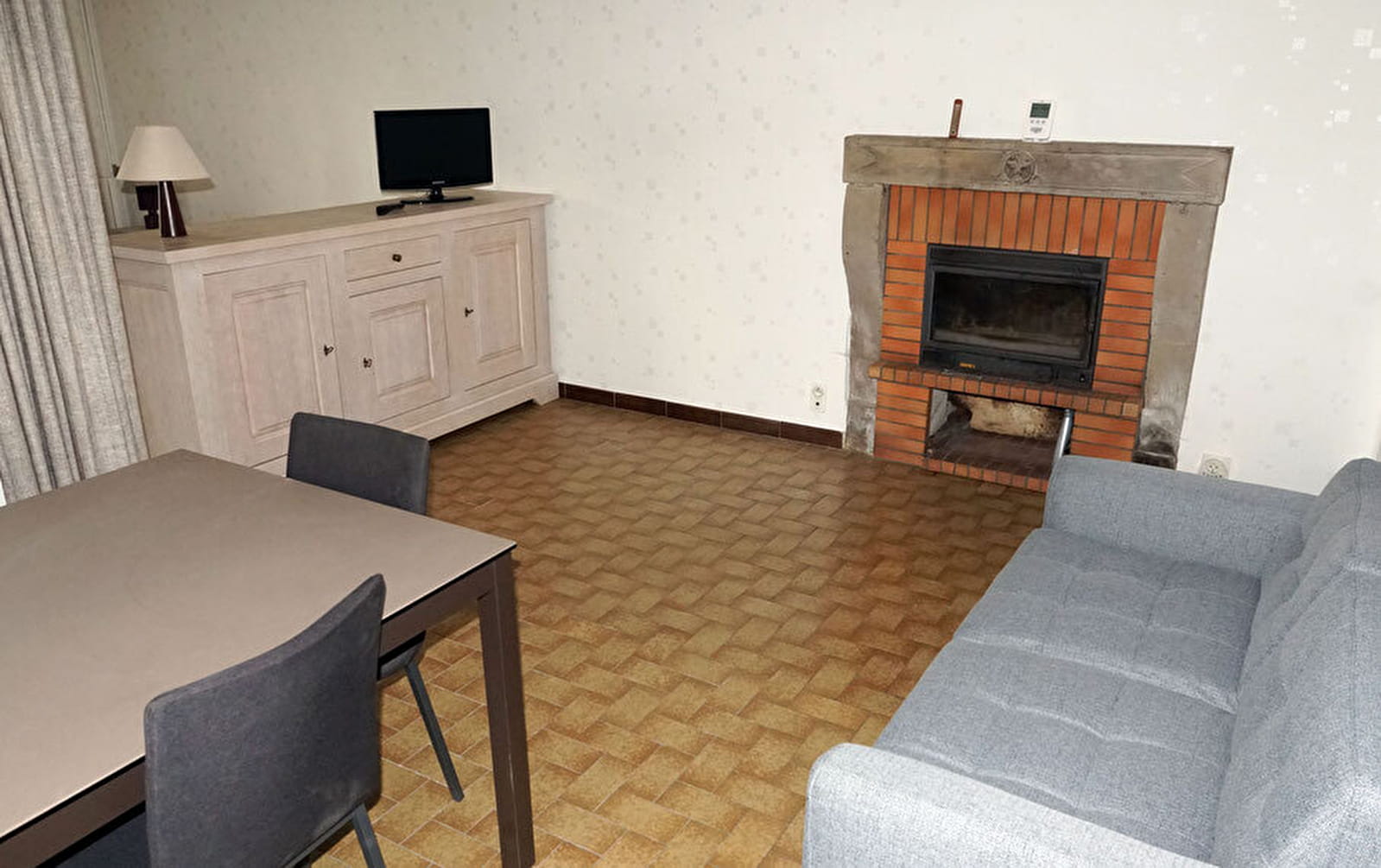 La pièce principale est partagée en deux espaces qui peuvent être isolés par un rideau : espace salon avec canapé, table, télévision ; espace chambre avec lit 140 x 190 cm (sont fournis deux couvertures, un édredon, deux oreillers carrés, un traversin), armoire-penderie.