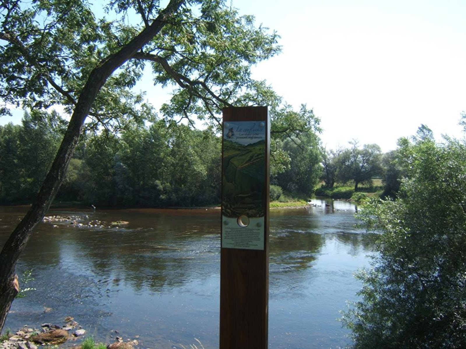 6 Poursuivre en direction du sud (panneau [ > "La Loire, une ressource en eau à préserver"] et rejoindre l’intersection formée avec la D 4, ou prenez d’abord à gauche une variante de 750 m (AR - 15 min) pour découvrir la confluence entre la rivière du Sornin et le fleuve Loire.