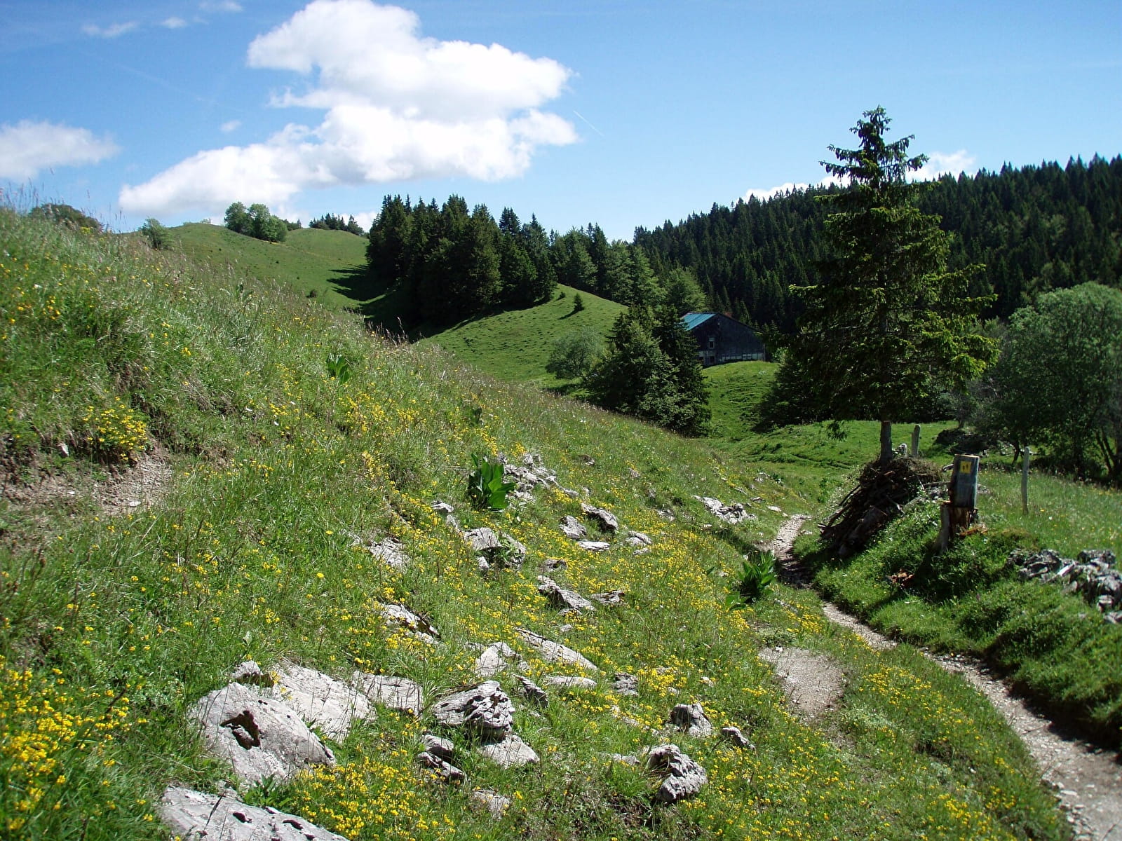 Le périple débute généralement au nord dans le pays de Montbéliard. N’hésitez pas à prendre le temps d’une visite de la ville des princes de Wurtemberg. Très rapidement, il évolue vers les plus hauts plateaux pour redescendre vers la très belle rivière du Doubs. Tout en côtoyant la frontière helvétique, il longe ses méandres jusqu’à Villers-le-Lac, puis fait place à une ambiance bucolique entre prairies où paissent les vaches montbéliardes, et forêts de feuillus. C’est le territoire des typiques fermes comtoises aux imposants « tuyés » où sont fumés les saucisses et les jambons, que vous mangerez certainement à l’étape. Pontarlier passé, le Fort de Joux, puis le lac Saint-Point marquent l’approche du sommet du Doubs : le Mont d’Or (1 463 m). De là, un magnifique panorama sur les Alpes vous forcera à la contemplation… vous voilà dans le Parc naturel régional du Haut-Jura. Des forêts d’épicéas aux combes verdoyantes, le sentier serpente dans cet espace préservé au riche patrimoine naturel. À Mouthe, village bien connu pour ses hivers rigoureux, vous arrivez à la source de la rivière que vous suivez depuis le début de votre périple et qui a donné son nom au département, le Doubs. Par la suite, vous passerez par Chapelle-des-Bois, sa combe et ses deux lacs, nichés entre la forêt du Mont-Noir et les falaises du Risoux. Aux Rousses, laissez-vous conter l’histoire de la forêt du Massacre avant de la traverser et imaginez l’oiseau qui vit ici, car si vous foulez son territoire, vous avez peu de chance de le croiser : le grand tétras, qui vit encore dans nos forêts, est un animal très discret. Sa présence est le résultat d’un environnement naturel préservé, héritage d’une montagne naturelle et rustique. Encore un petit effort en traversant les très belles Hautes-Combes et vous pourrez admirer la haute chaîne du Jura qui bientôt vous accueillera.
