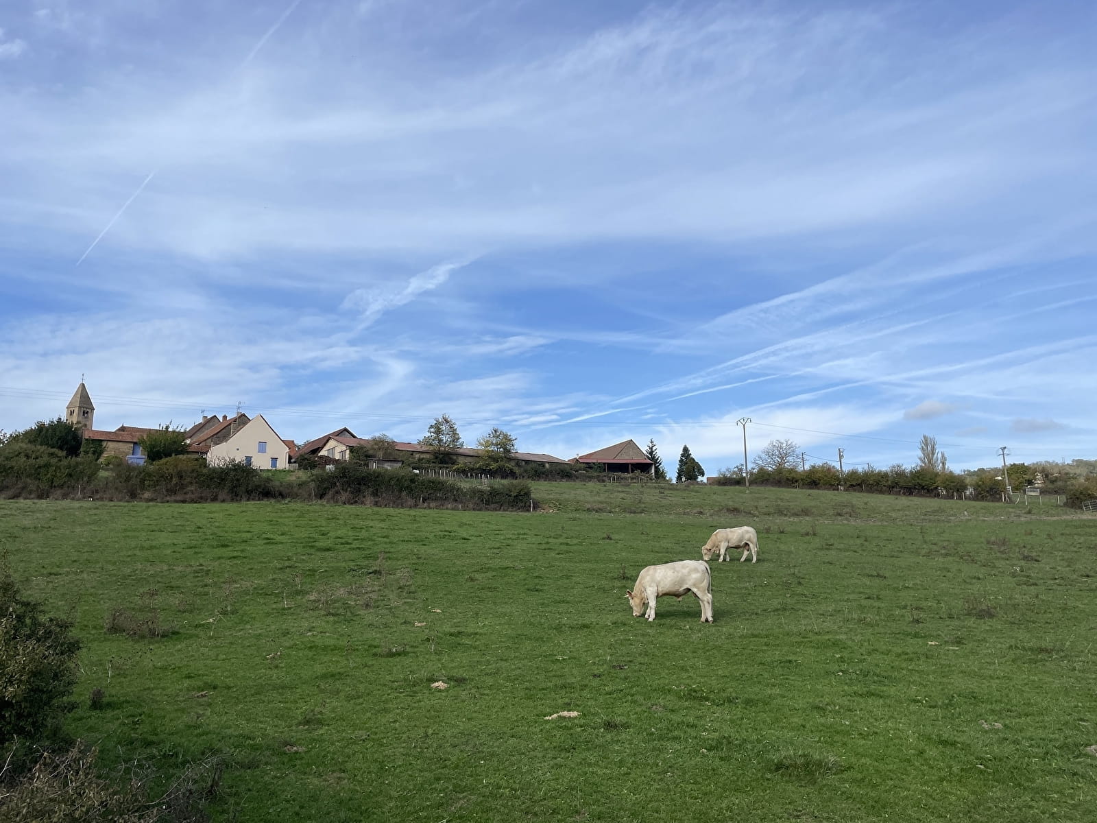 - Option 1 : Prendre sur la gauche au lieu-dit “Les Malatières” et remonter par une petite route bordée de champs; puis prendre à droite, suivre le sentier où les vignes s’étalent de chaque côté, d’où l’on peut admirer le bocage diversifié et le village groupé autour de son église. Quitter les vignes pour retrouver les prés jusqu’au village. Continuer par le chemin de la Belouse jusqu’au cimetière et par la D236 rejoindre la bascule.