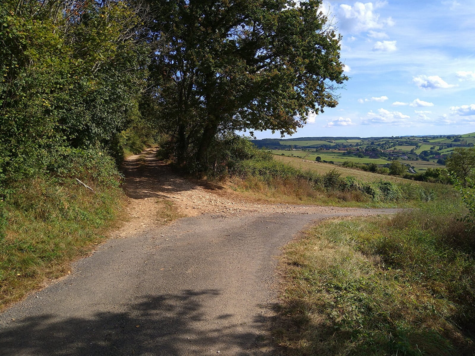 - Au carrefour dit “du Poirier Budin”, continuer tout droit dans ce chemin cerné de bois et de champs jusqu’à une route qui conduit au lieu-dit “La Platrière” pour emprunter la voie romaine vers Saint-Clément-sur-Guye. Remonter le chemin des Roches. Il convient de s’arrêter pour admirer le village. En face se détache l’étendue des vignes. De ce côté du village, elles ont fait place aux prés et bois.