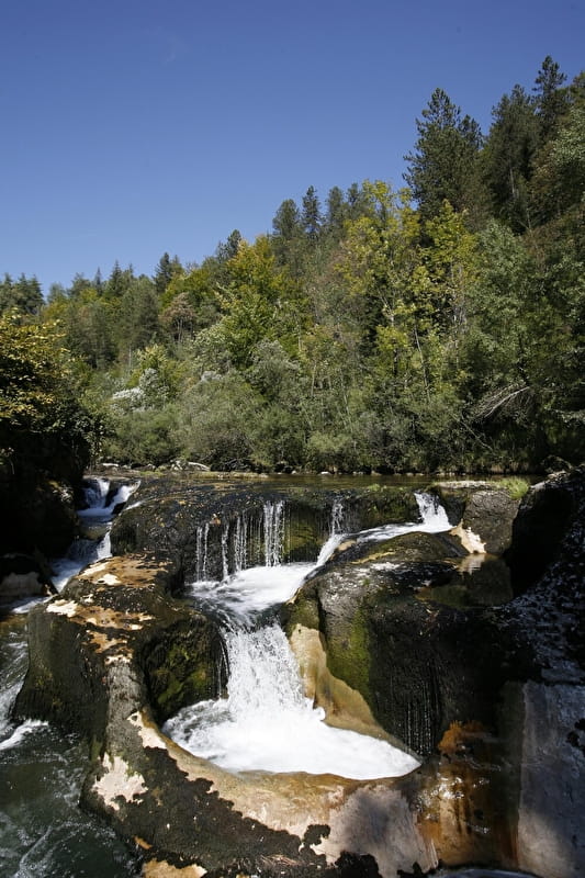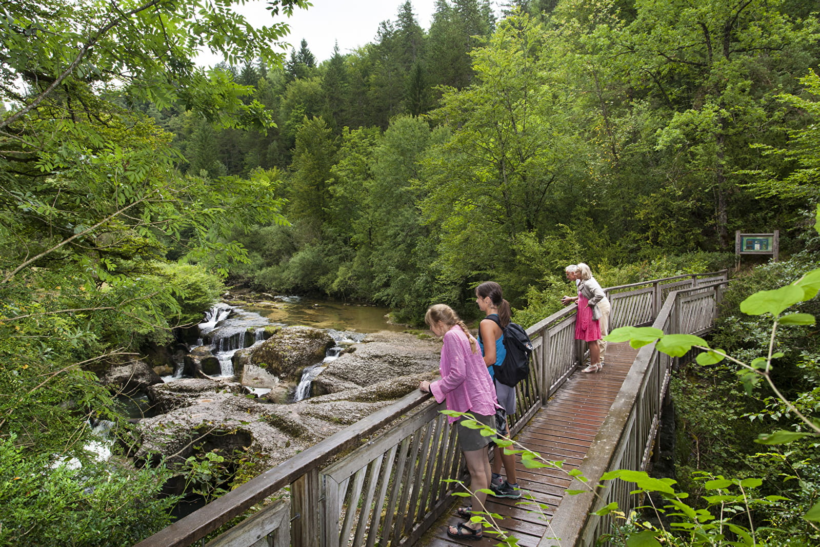 3. Prenez le petit chemin sur la gauche qui longe d’abord une haie, après un lacet vous arriverez alors au pont qui traverse la Semine et offre un point de vue splendide sur les Marmites de Géant. Vous pouvez vous approcher des Marmites mais soyez prudents ! La baignade est interdite.