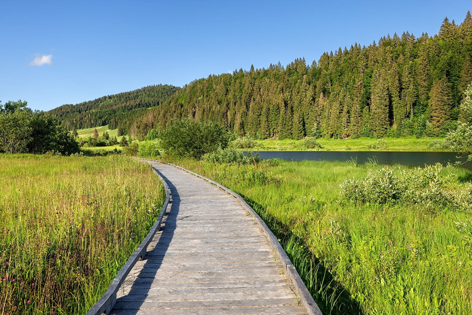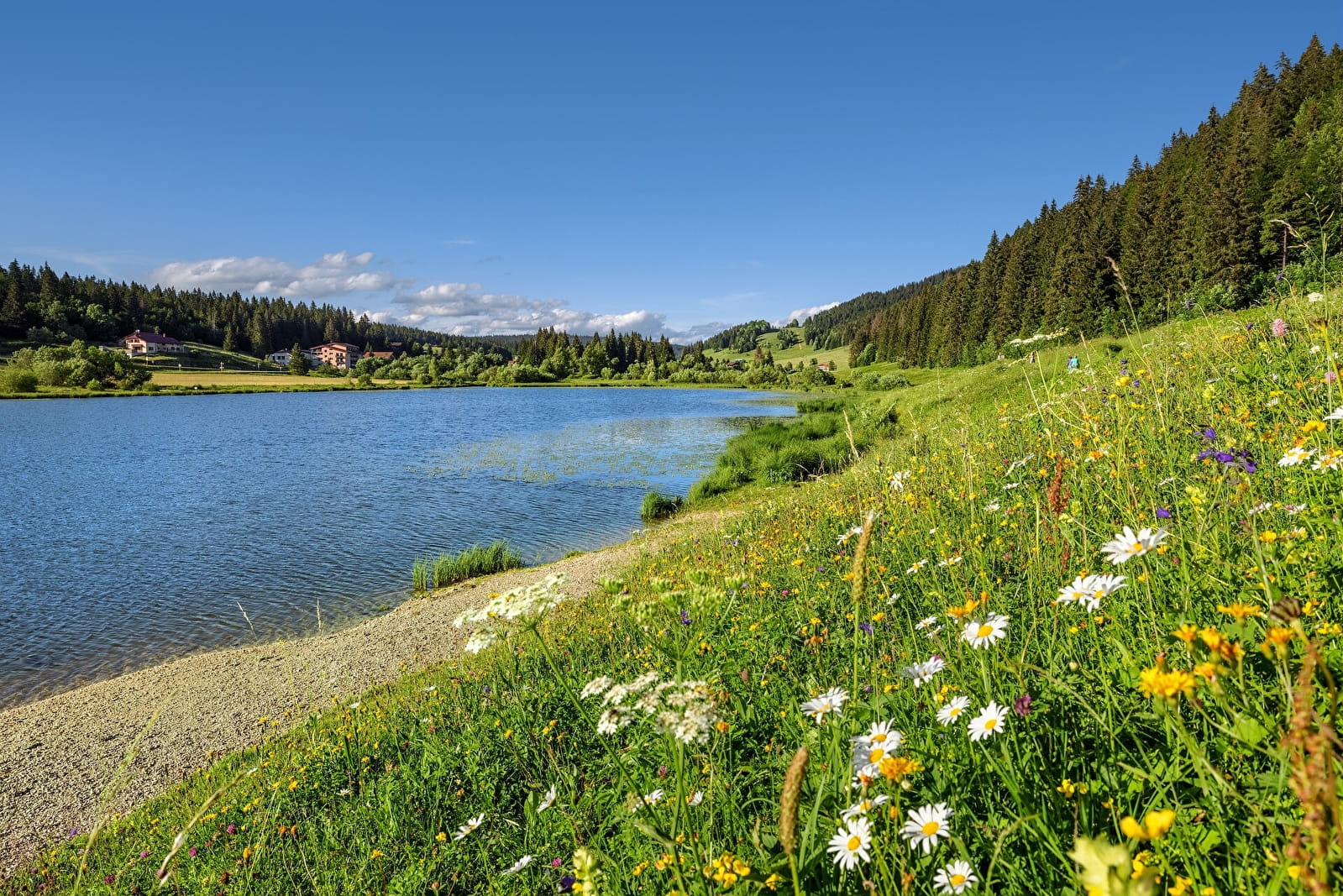 Cette randonnée, majoritairement en forêt, permet d’atteindre la Vigoureuse, qui offre une vue sur les Monts Jura, le Crêt de Chalam, le Col de la Faucille, ainsi que le Mont Blanc. Et au retour, pourquoi ne pas opter pour une baignade rafraichissante dans le lac de Lamoura. Itinéraire officiel - réseau Geotrek du Parc naturel régional du Haut-Jura