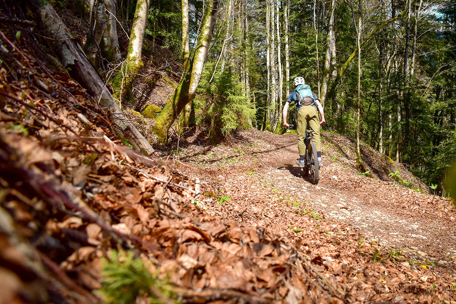 En bas, la remontée tranquille se fait par une route forestière isolée, parfaite pour reprendre son souffle. Le final en balcon, juste sous les parois calcaires, parfait le tableau.