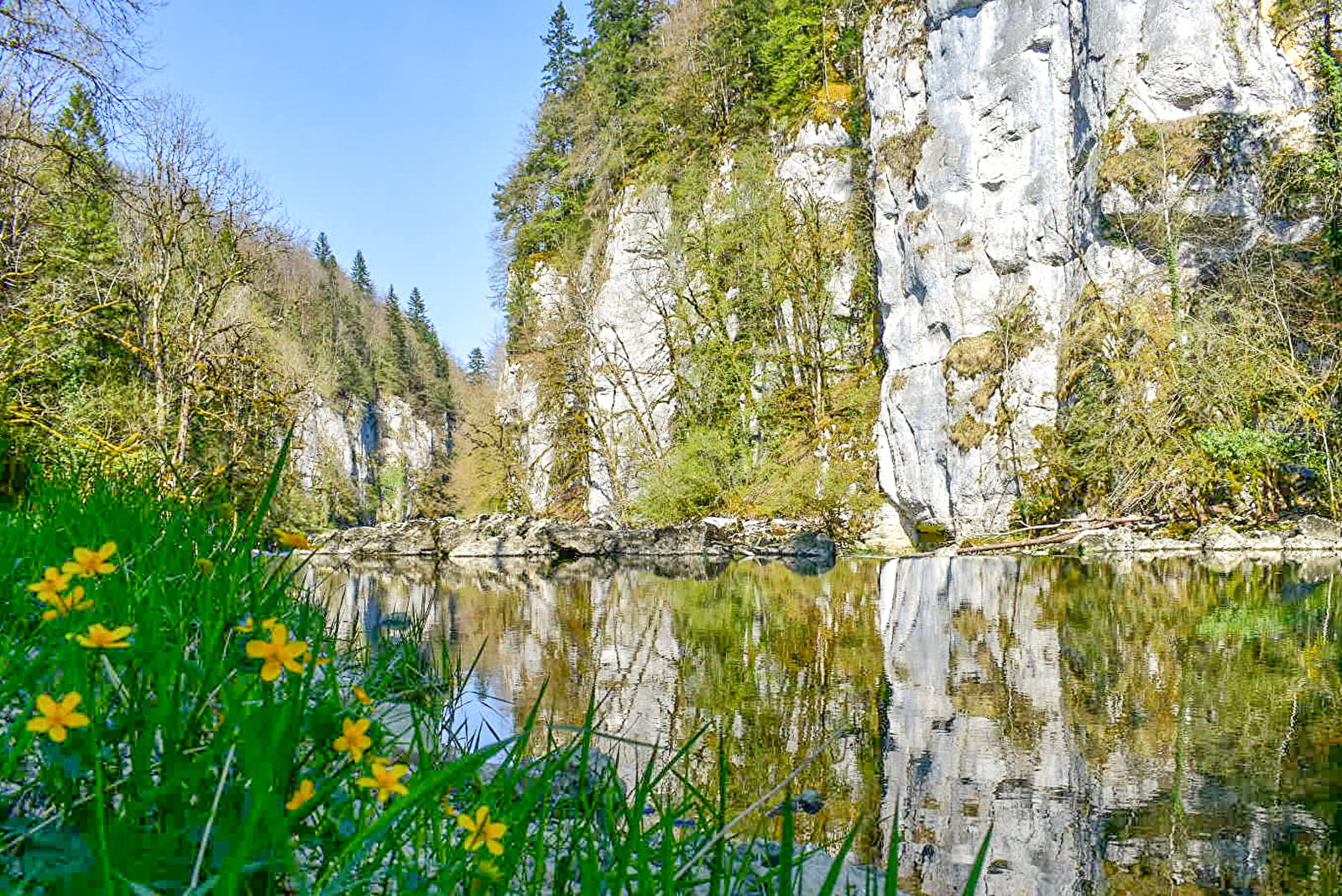 Dès les premiers kilomètres, le ton est donné : le belvédère de la Cendrée, accessible via un aller-retour, ouvre le bal avec une vue vertigineuse. Puis vient la descente, tout en sensations, dans les gorges du Doubs par le bois de la Biche, jusqu’à un sentier balcon sous les falaises. En chemin, deux pauses s’imposent : les Échelles de la Mort et la Charbonnière du Haut, tous deux offrant des panoramas inoubliables – à condition d’accepter de s’écarter un peu du tracé principal.