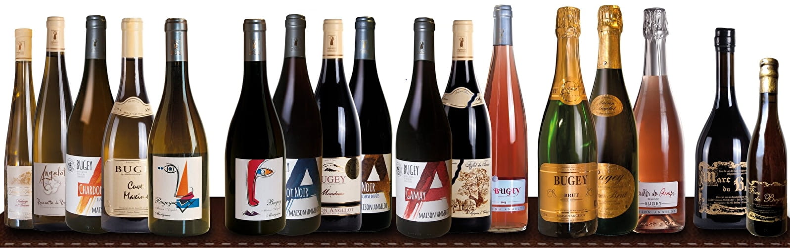 Les vins du caveau : Bugey Blanc, Bugey Rouge, Bugey Méthode Traditionnelle, Bugey Rosé, Roussette du Bugey, Marc et Fine du Bugey.