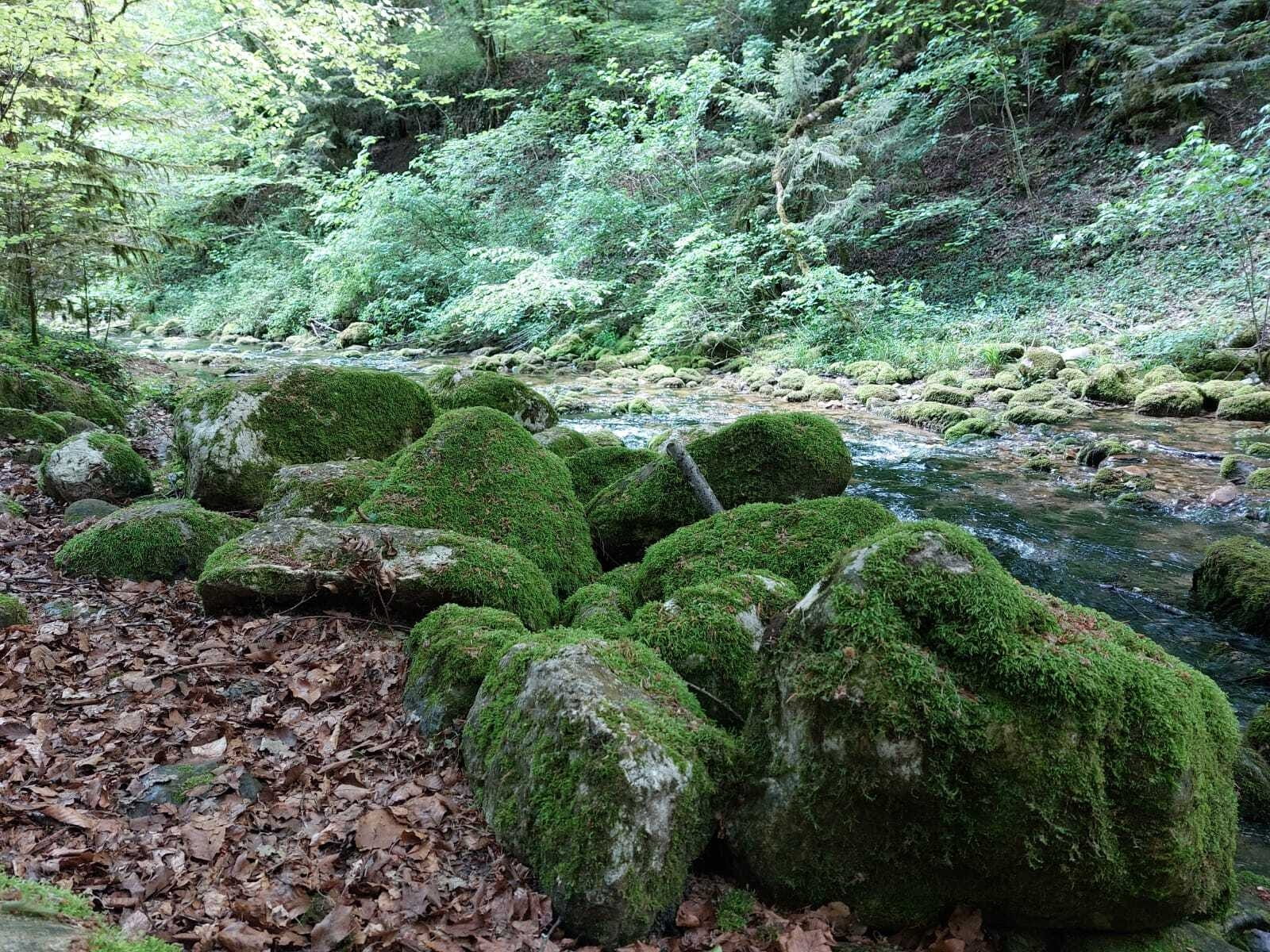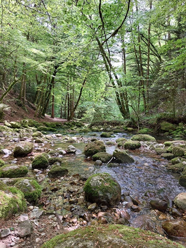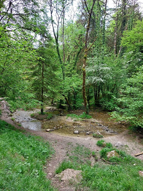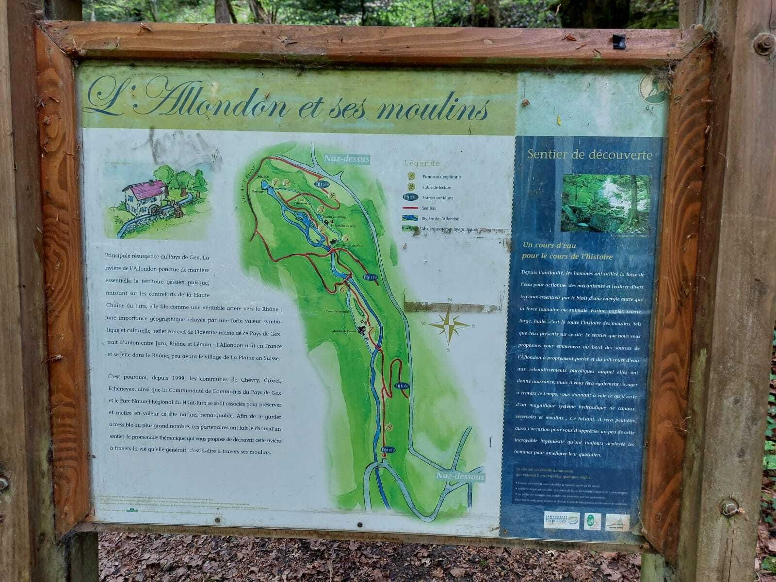 Alimentée par les eaux qui s’infiltrent du jura, l’Allondon est une résurgence qui s’écoule, en plusieurs sources, au pied d’un petit aplomb rocheux. Abondant à la fonte des neiges au mois de mars, ou après un fort orage, son débit peut atteindre 7 m à la seconde. À l’inverse, en période d’étiage, c’est-à-dire de basses eaux, comme au mois d’août ou de septembre, il est plutôt faible, les sources pouvant même aller jusqu’à se tarir en période de grande sécheresse. Toutefois l’emplacement et la vivacité de ses eaux a constitué jusqu’au siècle dernier, une aubaine que les hommes et les femmes de ce petit territoire ont largement su mettre à profit comme en témoignent les ruines des moulins de Naz-Dessus et de Crozet que nous avons rencontrées.