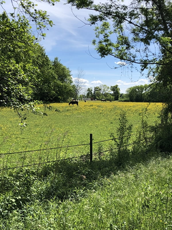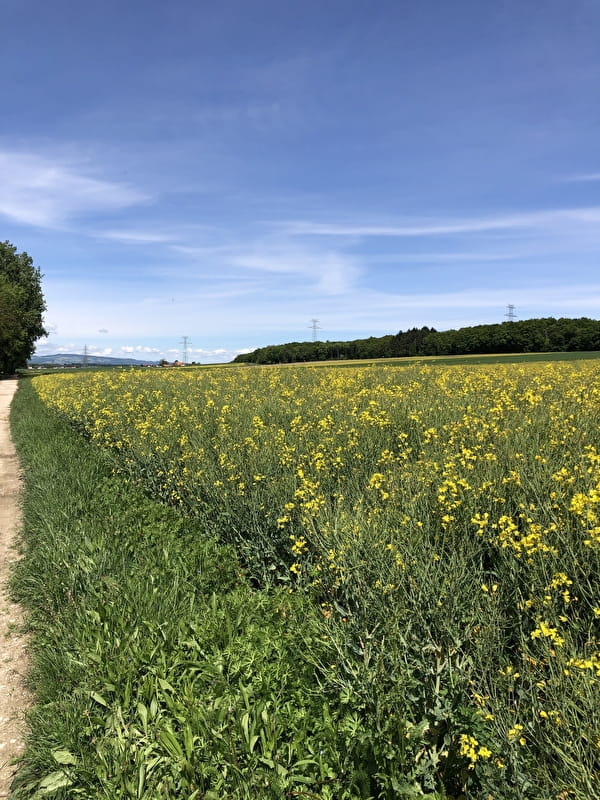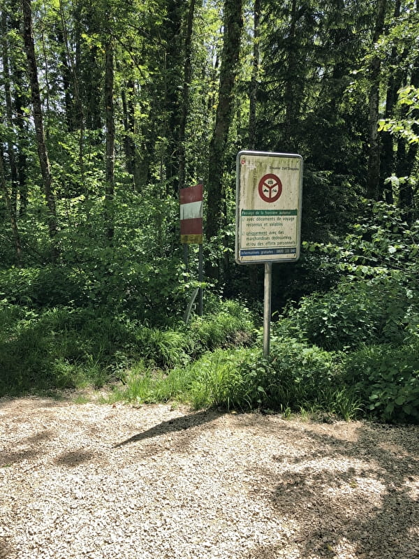 Plus loin une fois la seconde fontaine passée, vous arriverez à un premier embranchement, prendre à droite. Ce chemin traversant les champs n'est pas goudronné, continuez sur ce dernier et au nouvel embranchement prendre à gauche. Traversez le pont au dessus de la rivière La Versoix, vous êtes à présent en Suisse. Poursuivez votre chemin et à l'intersection prendre à gauche, un panneau orange vous indiquera la direction de "Nyon". Continuez toujours tout droits à travers les champs tout en profitant du paysage jusqu'à arriver à la route principale goudronnée.
