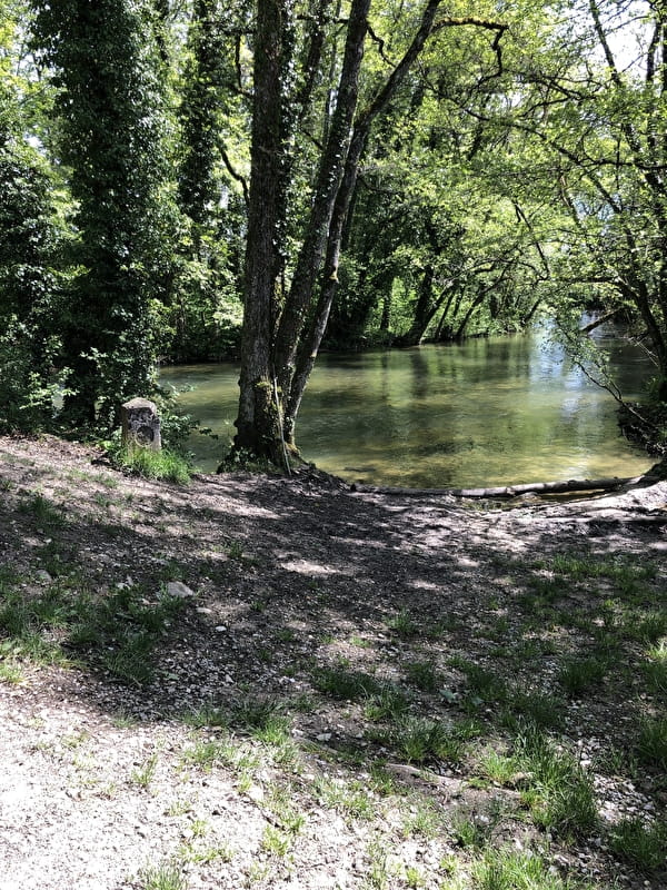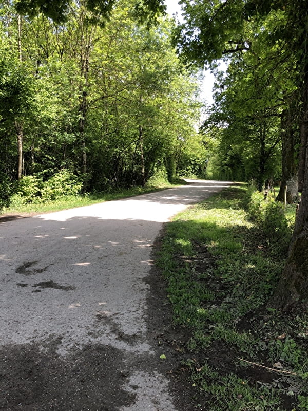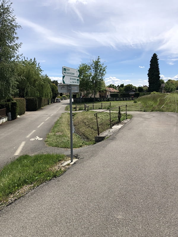 Rejoindre la voie verte et allez sur la droite. Traversez la route au niveau des barrières en bois et suivre le chemin goudronné. Vous trouverez de nouveau des barrières en bois, passez-les et poursuivez votre chemin. Sur votre gauche vous pourrez probablement voir des chevaux. Arrivé au bout vous entrerez dans Grilly, suivre la piste cyclable et traverser le parking sur la gauche. Longez le parc pour enfants qui se trouvera sur votre gauche et prendre le petit chemin en allant à droite. Au bout, rester sur le trottoir de gauche où vous passerez une première fontaine. Continuez toujours tout droit en suivant la route goudronnée, vous y trouverez une seconde fontaine où vous continuerez tout droit.
