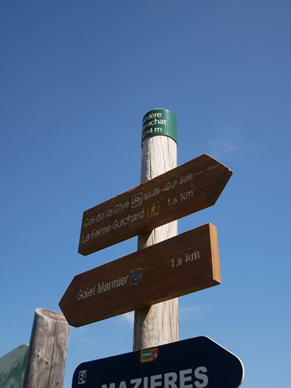 Le chemin rejoint la route goudronnée donnant accès aux téléskis à hauteur du transformateur. La remonter jusqu'au parking, contourner le chalet du téléski et monter la route qui passe sous la ligne électrique puis, sous le câble du remonte-pente.