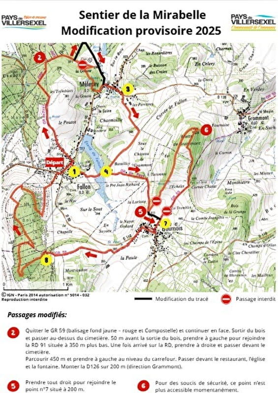 MISE A JOUR 2025: suite à des travaux forestiers, le tracé de cette randonnée est modifié pour toute l'année. Les accès à l'ancien cimetière de Mélecey et à la Motte de Grammont sont interdits.