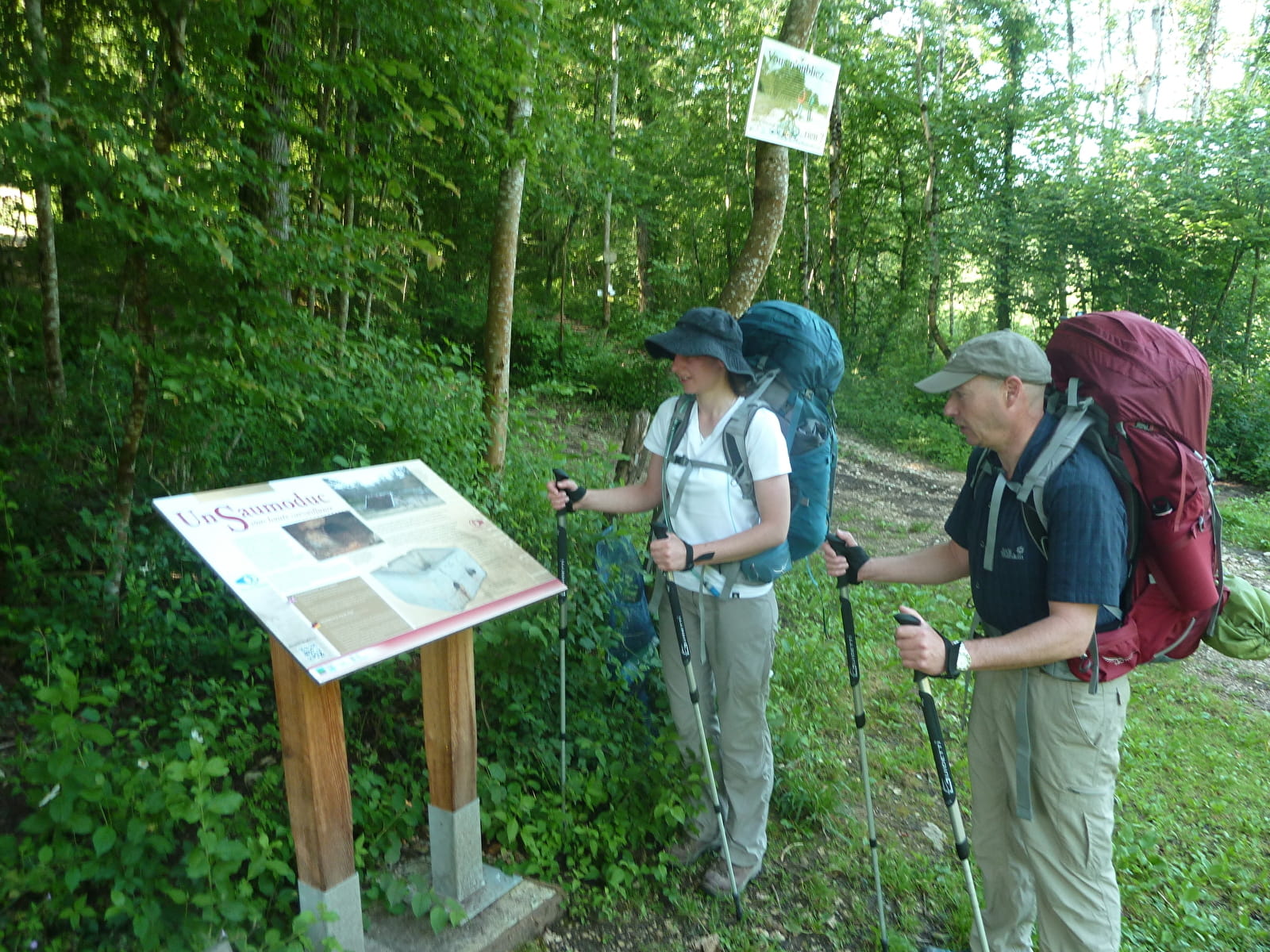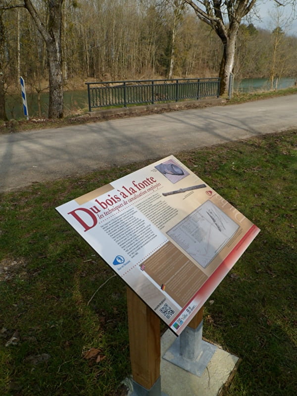Le sentier des Gabelous suit approximativement le tracé historique du saumoduc, double conduite de bois qui permettait à la Saline Royale d'Arc et Senans de recevoir la saumure extraite depuis la Saline de Salins les Bains.
