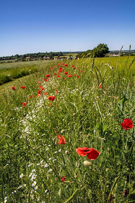(7) Au croisement de la route D3, virer à gauche en direction de l'obélisque. À ce monument, prendre à gauche le chemin enherbé, passer au pied des gisants et descendre tout droit. Au bout de ce chemin, l'arrivée dans le village de Fontenoy se termine par la rue de gauche (D/A).