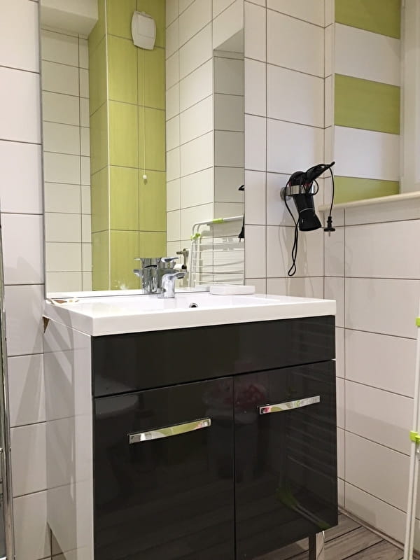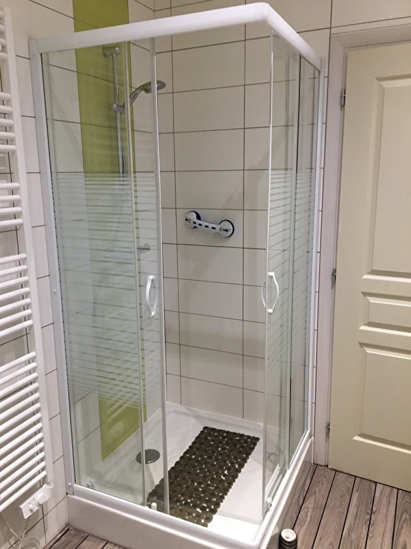 - une grande salle d'eau indépendante entièrement carrelée avec cabine de douche, lavabo et toilettes.