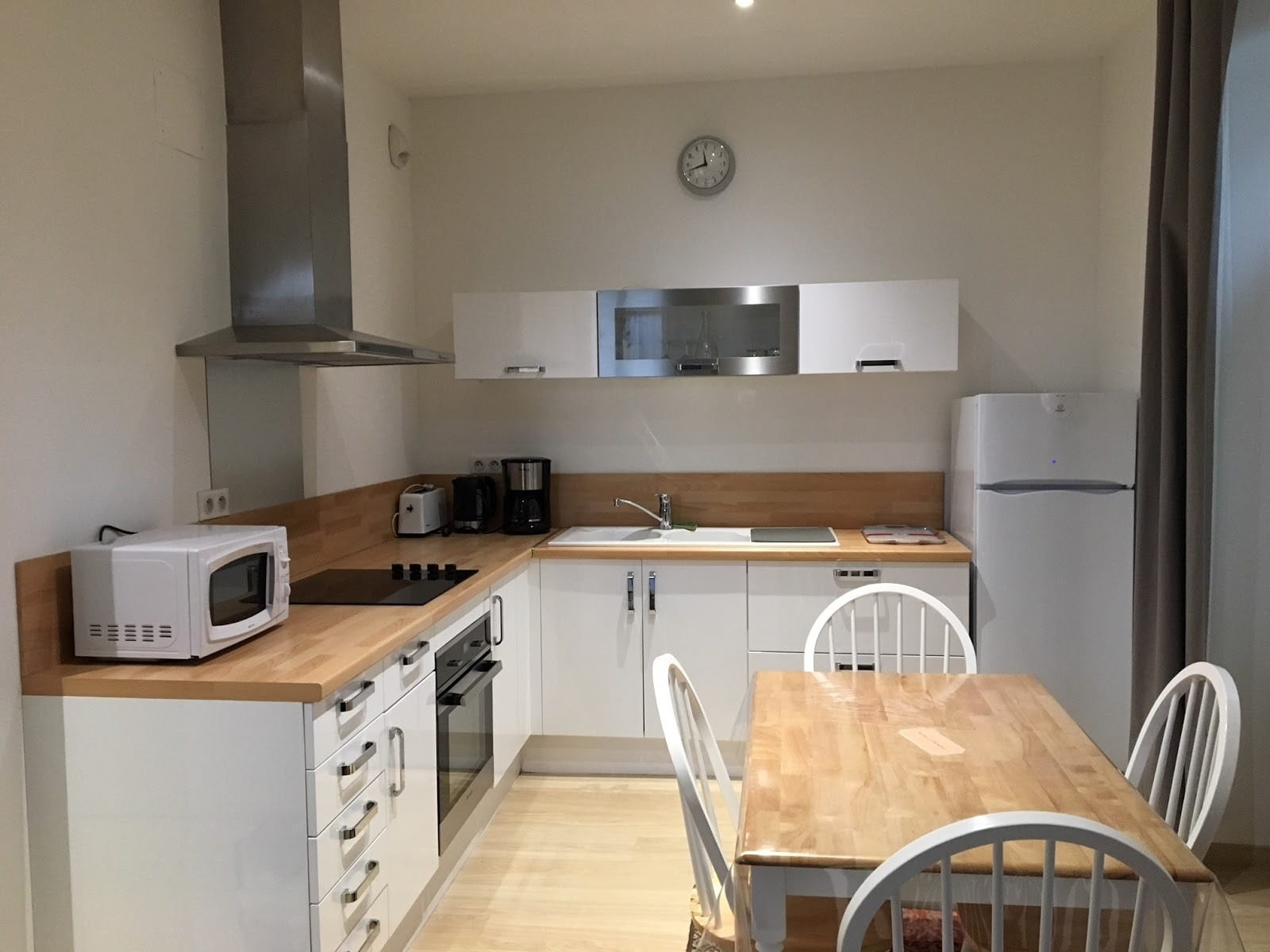 - une belle pièce à vivre avec 2 fauteuils, une télévision à écran plat, ouverte sur une cuisine équipée (plaque vitrocéramique, frigo avec compartiment congélateur), un coin repas avec une table et 4 chaises.